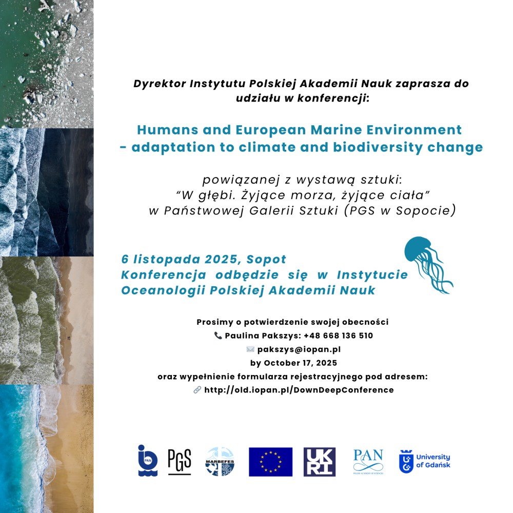Instytut Oceanologii Polskiej Akademii Nauk serdecznie zaprasza do udziału w międzynarodowej konferencji naukowej „Humans and European Marine Environment – Adaptation to Climate and Biodiversity Change”, która odbędzie się 6 listopada 2025 roku w godz. 10:00–19:00 w siedzibie Instytutu Oceanologii PAN w Sopocie.