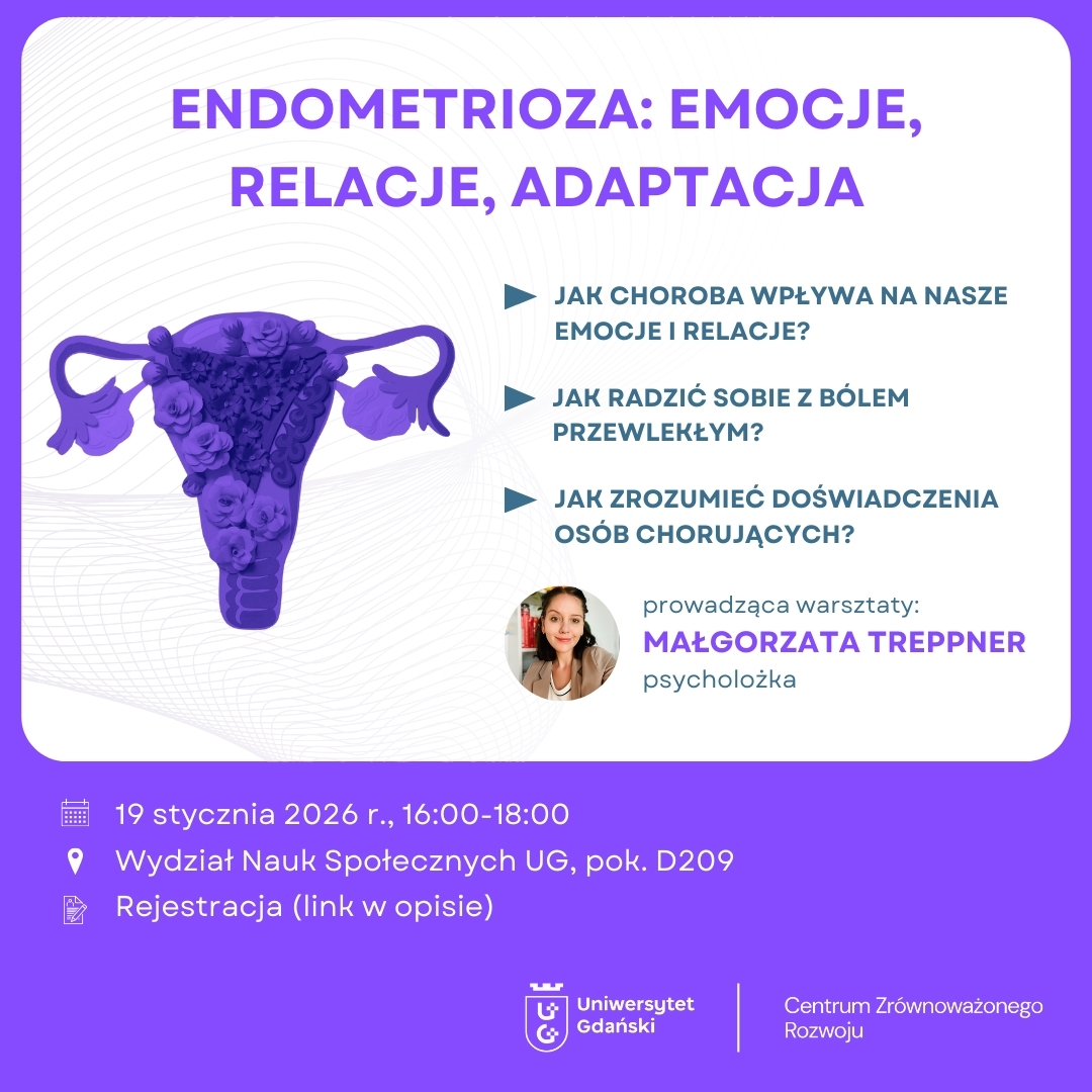 Endometrioza wpływa nie tylko na ciało, ale również na emocje, relacje i poczucie tożsamości. Kolejne spotkanie z cyklu warsztatów poświęconych tej chorobie poświęcone będzie właśnie jej psychologicznym aspektom. Prowadzi Małgorzata Treppner, psycholożka i doktorantka w Szkole Doktorskiej UG. Warsztaty organizuje Centrum Zrównoważonego Rozwoju UG.