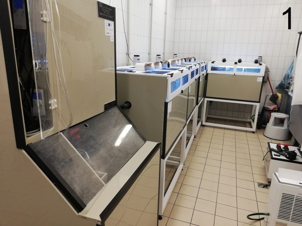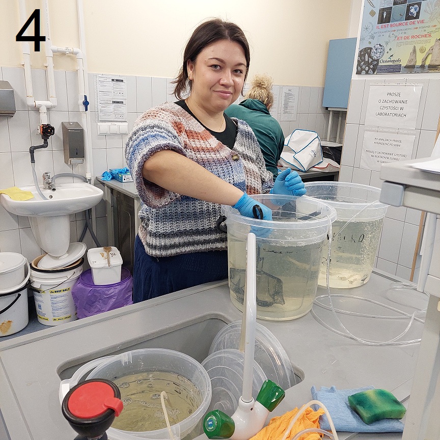 W październiku 2025 w laboratoriach hodowlanych Katedry Ekologii Morza rozpoczął się drugi cykl hodowli krewetki białonogiej Penaeus vannamei (https://krewetka.ug.edu.pl/), stanowiący część jednego z trzech eksperymentów pilotażowych - TARAS „Testing Algae Applications in Recirculating aquaculture systems (RAS) to improve aquaculture circularity potential in the SB region”, realizowanych w ramach projektu AquaLoop (http://aqualoop.edu.pl/). Hodowla prowadzona jest w systemie ze zwrotnym obiegiem wody, tzw. RAS (z ang. Recirculating Aquaculture System). W jego skład wchodzą cztery zbiorniki hodowlane o łącznej objętości 1200 litrów (zdjęcie 1), połączone z komorą do oczyszczania i kondycjonowania wody, wyposażoną m.in. w filtry (mechaniczne i biologiczne) oraz skimmer. Materiał do hodowli (stadia post-larwalne, n=3000) pozyskano z wylęgarni White Panther Produktion GmbH w Austrii. Hodowla jest prowadzona w wodzie o temperaturze 26-27°C i zasoleniu 20, a jednym z jej celów jest określenie wpływu suplementacji paszy drożdżami i probiotykami na przeżywalność i wzrost P. vannamei we współpracy z niemiecką firmą Biochem GmbH. Dwunastotygodniowym eksperymentem, który rozpoczął się w grudniu 2025 roku, kieruje p. dr Joanna Hegele-Drywa (zdjęcie 2) z Pracowni Ekofizjologii i Bioenergetyki KEM. Bierze w nim udział także p. Zuzanna Rozmus (zdjęcie 3), studentka 3 roku studiów pierwszego stopnia na kierunku Oceanografia, która zbiera wyniki do pracy licencjackiej oraz doktorantka, p. mgr Marta Gostkowska (zdjęcie 4). W hodowlę jest również zaangażowanych 5 studentów 2 roku studiów pierwszego stopnia na kierunku Oceanografia, w ramach wolontariatu i praktyk studenckich, wykonywanych pod opieką dr Hegele-Drywy. W kolejnym etapie pilotażu TARAS przeprowadzone zostaną badania dotyczące możliwości wykorzystania wody z produkcji krewetek do hodowli mikroglonów. Mimo, że system RAS pozwala na oczyszczenie i recyrkulację wody z hodowli, to nie jest on w 100% wydajny. Z tego względu szuka się możliwości wykorzystania zanieczyszczonej wody. Wśród nich jest m.in. hodowla mikroglonów, które z jednej strony w trakcie wzrostu usuwają z wody biogeny, z drugiej zaś produkują biomasę bogatą w kwasy tłuszczowe omega-3, która może służyć jako suplement diety dla krewetek. Tą częścią badań kieruje dr Filip Pniewski z Katedry Funkcjonowania Ekosystemów Morskich.