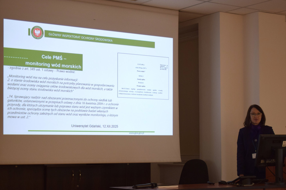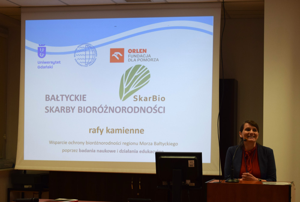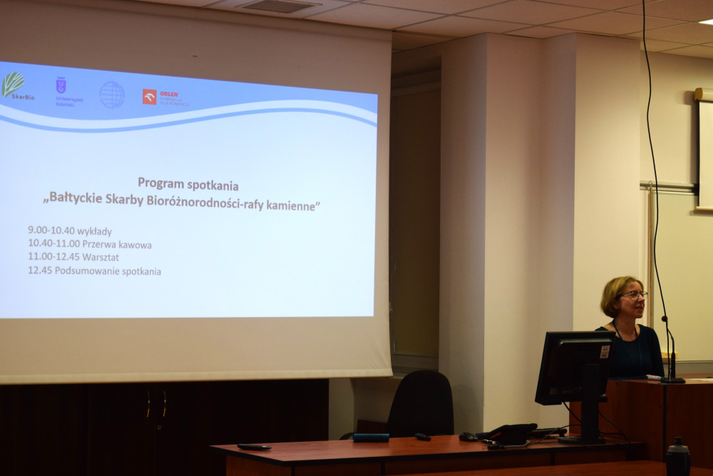 Kierownik projektu SkarBio, dr hab. Urszula Janas, prof. UG , zaprezentowała założenia projektu oraz rejon prowadzonych badań, obejmujący trzy kamienne rafy Polskich Obszarów Morskich.