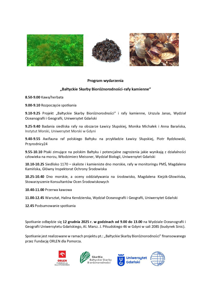 W dniu 12 grudnia 2025 roku, w ramach projektu Bałtyckie Skarby Bioróżnorodności - SkarBio, odbył się specjalistyczny warsztat pt. „Bałtyckie Skarby Bioróżnorodności – rafy kamienne”. Spotkanie miało na celu stworzenie trwałej platformy współpracy oraz wymiany wiedzy pomiędzy środowiskiem naukowym a innymi interesariuszami zaangażowanymi w ochronę bioróżnorodności Morza Bałtyckiego, ze szczególnym uwzględnieniem raf kamiennych południowego Bałtyku.